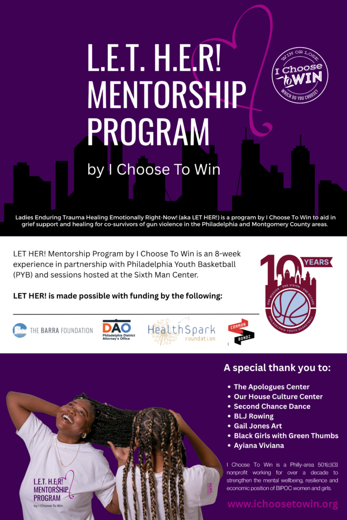 Ladies Enduring Trauma Healing Emotionally Right-Now! aka LET HER! is a program by I Choose To Win to aid in grief support and healing for co-survivors of gun violence in the Philadelphia and Montgomery County areas launches April 18th.