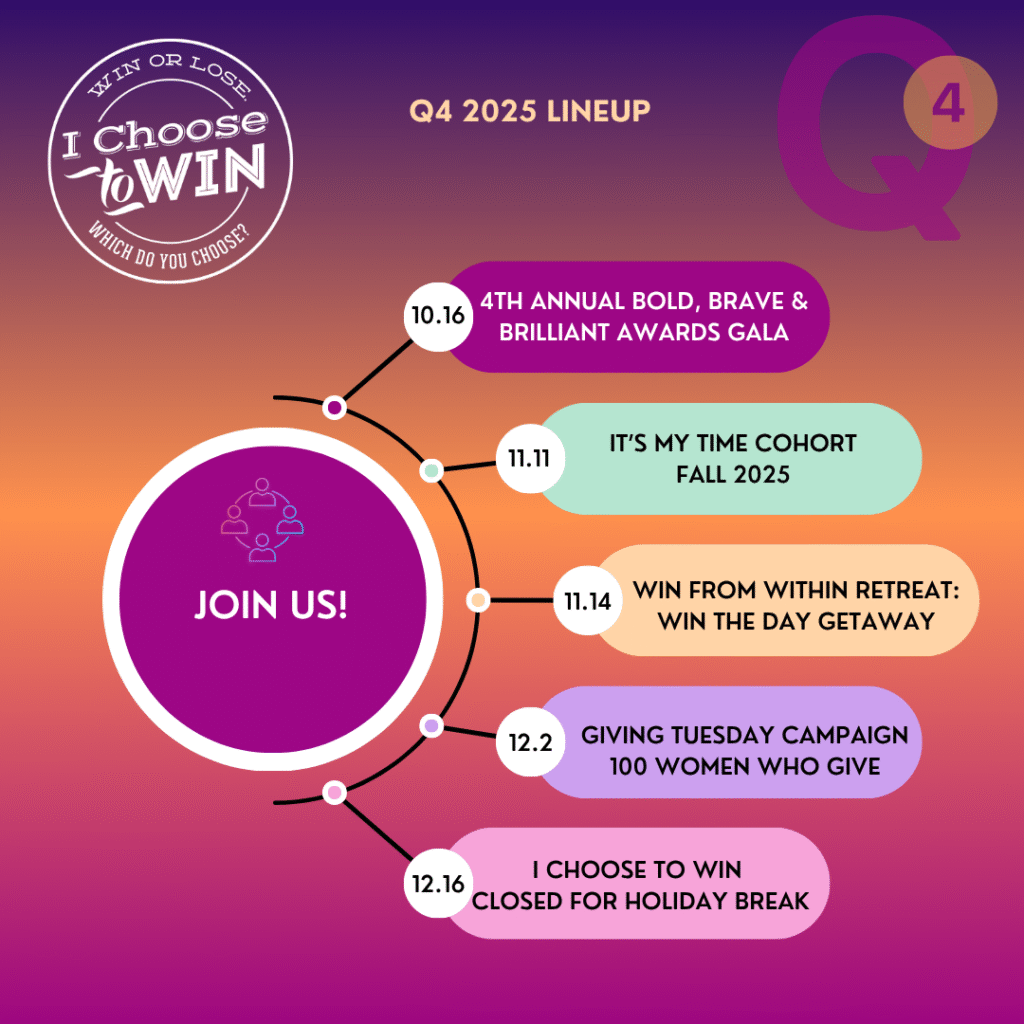 Here’s an overview of programs, activities and experiences offered by I Choose To Win in the fourth quarter of the year. In summary, we will hold our 4th annual fundraiser and awards gala, so be sure to purchase your ticket and count yourself in attendance. This year, in addition to highlighting the distinguished lineup of women honorees, we will celebrate 10 years of service. Our decade of impact celebrations will engage volunteers, donors, sponsors, community members and guests.